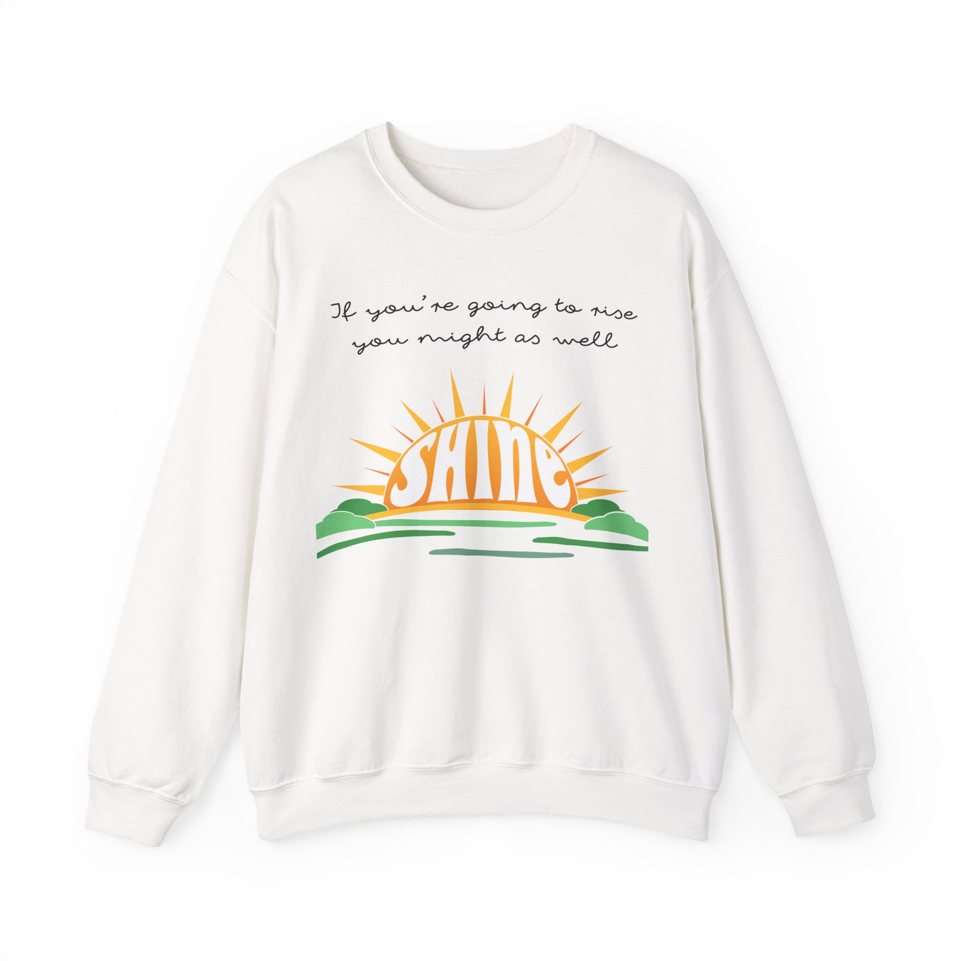 This cozy crewneck brings a gentle, optimistic note to quiet mornings and slow weekends. Soft, medium-weight fleece wraps you in warmth while a sunburst graphic and hand-lettered line—"If you're going to rise you might as well SHINE"—lift the mood without shouting. The clean white backdrop and subtle green horizon make the design feel fresh and wearable with leggings, jeans, or layered under a jacket. Wear it to ease into a chilly sunrise walk, to sip coffee at your favorite window seat, or to share a calm, encouraging vibe with friends. Thoughtful construction—flat seams, ribbed collar and cuffs, and durable double-needle stitching—means it holds its shape and keeps its soft hand after repeated wear. The understated look fits into a slow-living wardrobe and becomes one of those go-to pieces you reach for when you want comfort with a quiet spark.